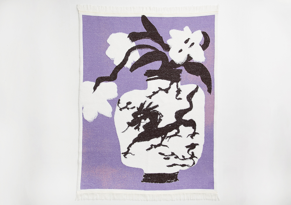 Soft throw with a dragon vase pattern and fringes.
