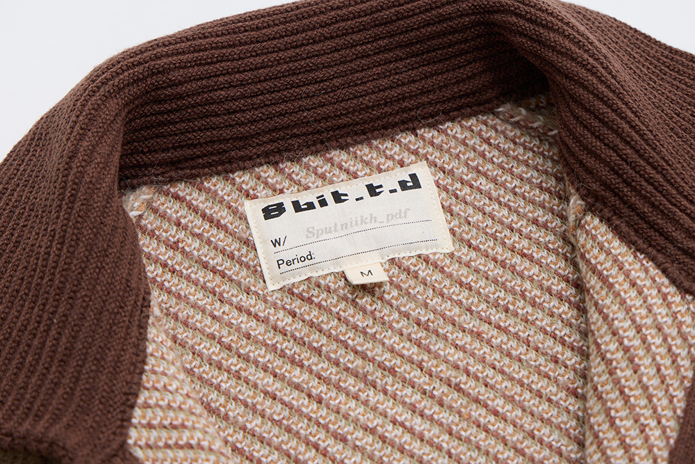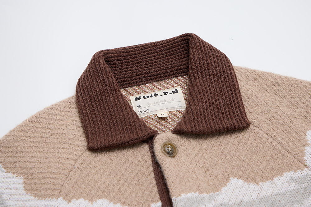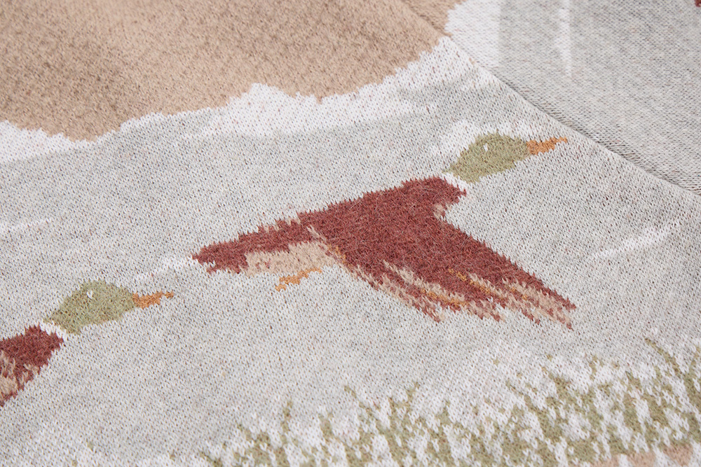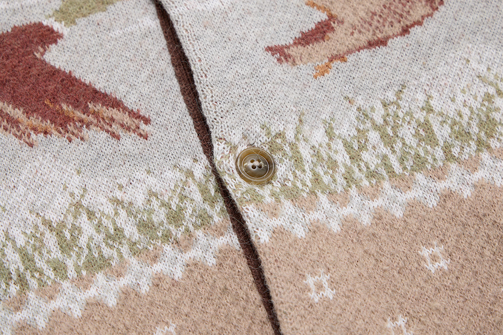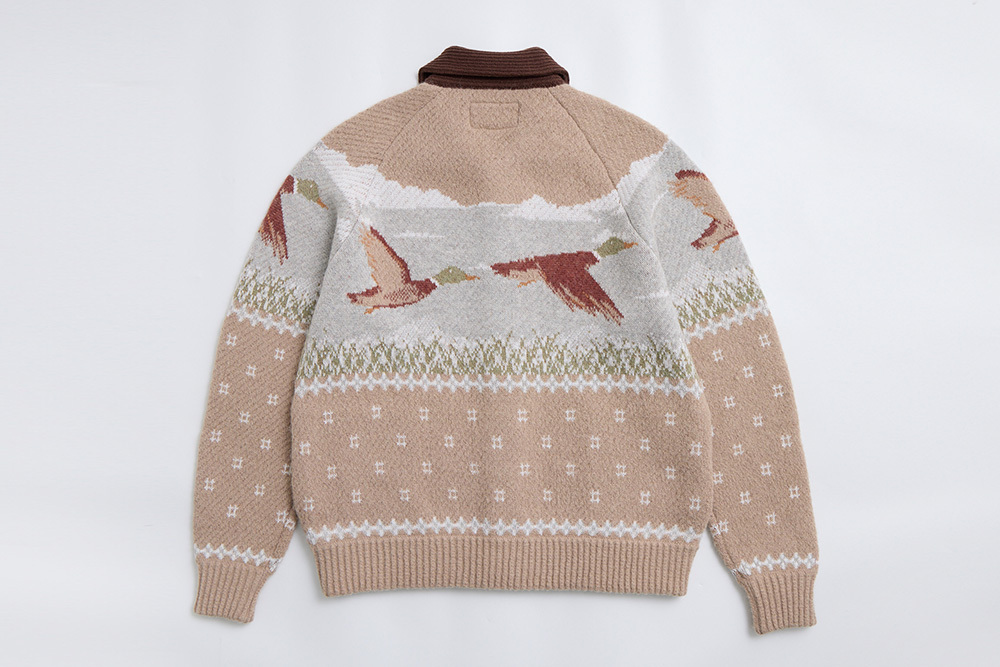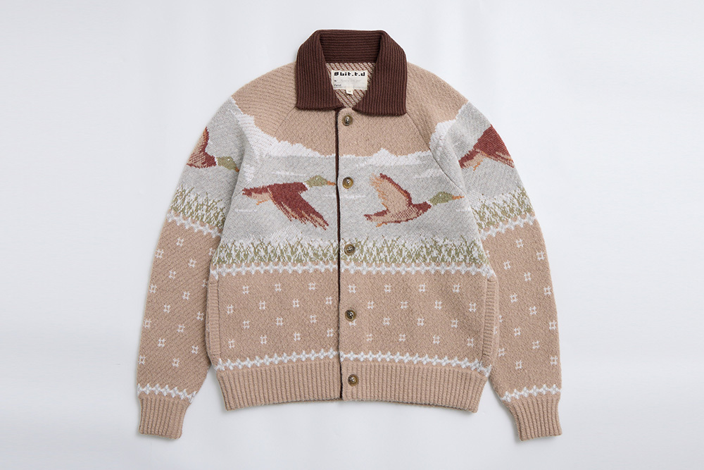 Inspired by ducks seen at Inokashira Park and a nostalgic hot pot shop sign, this piece depicts ducks in continuous flight. The vintage hunting jacket–inspired design features contrasting collars and plackets for a playful finish.