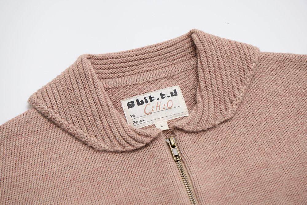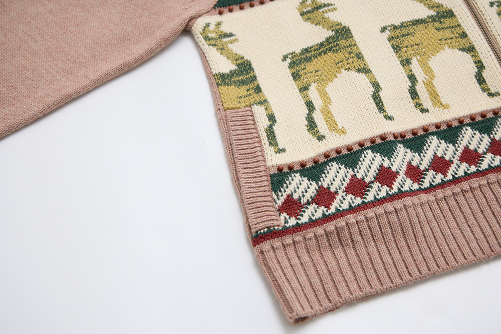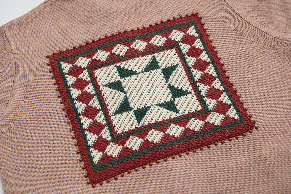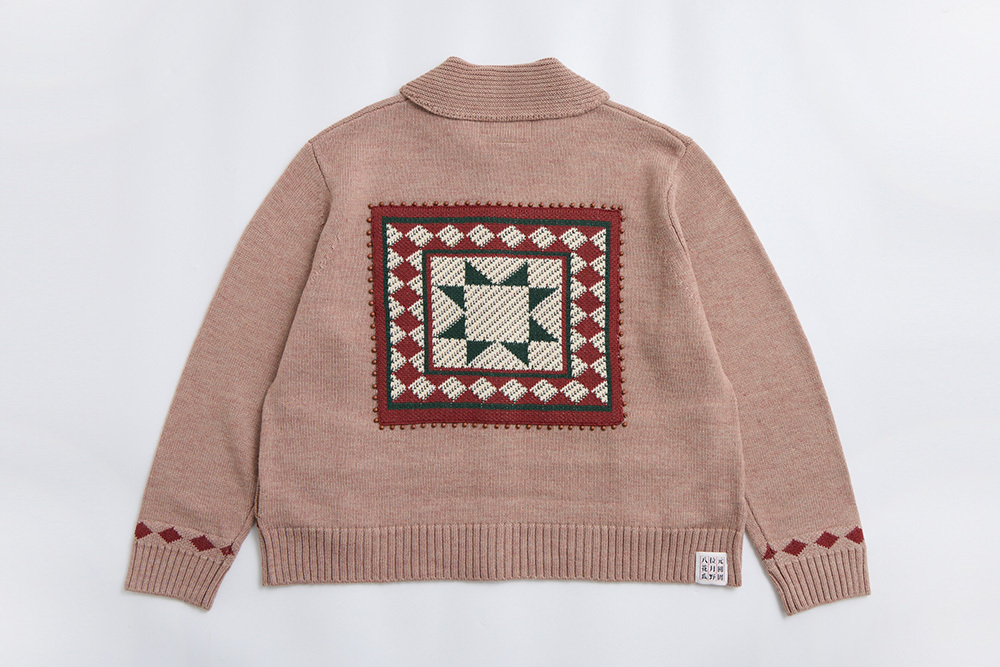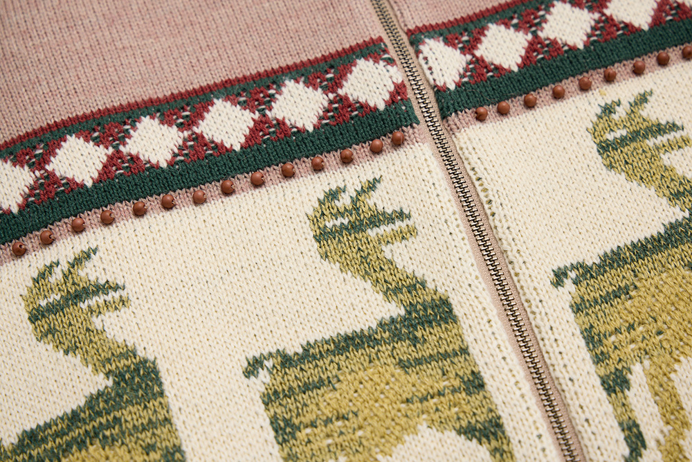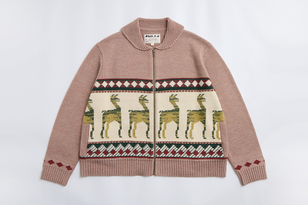 The Guanaco motif is inspired by a woven blanket photographed during a trip to South America, with the pattern featured on the front of the cardigan. The back showcases geometric tile designs from the region, while the edges are hand-sewn with a row of wooden beads to add distinctive detailing.