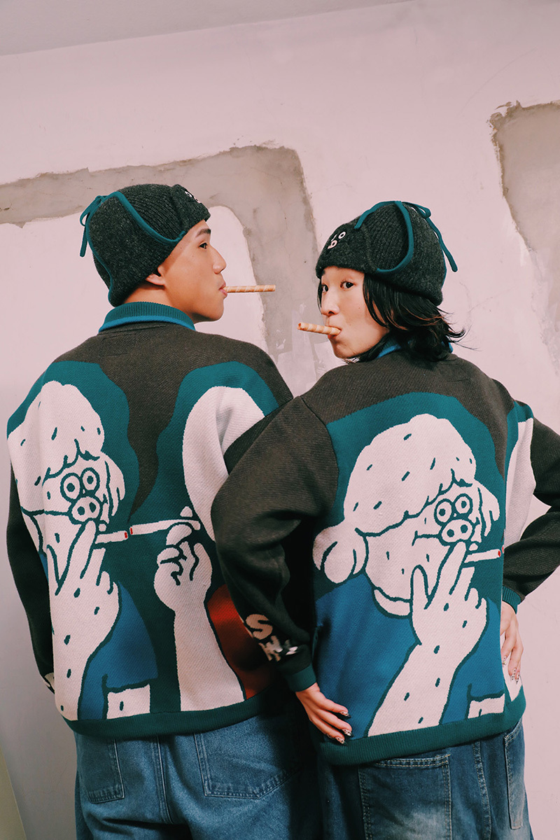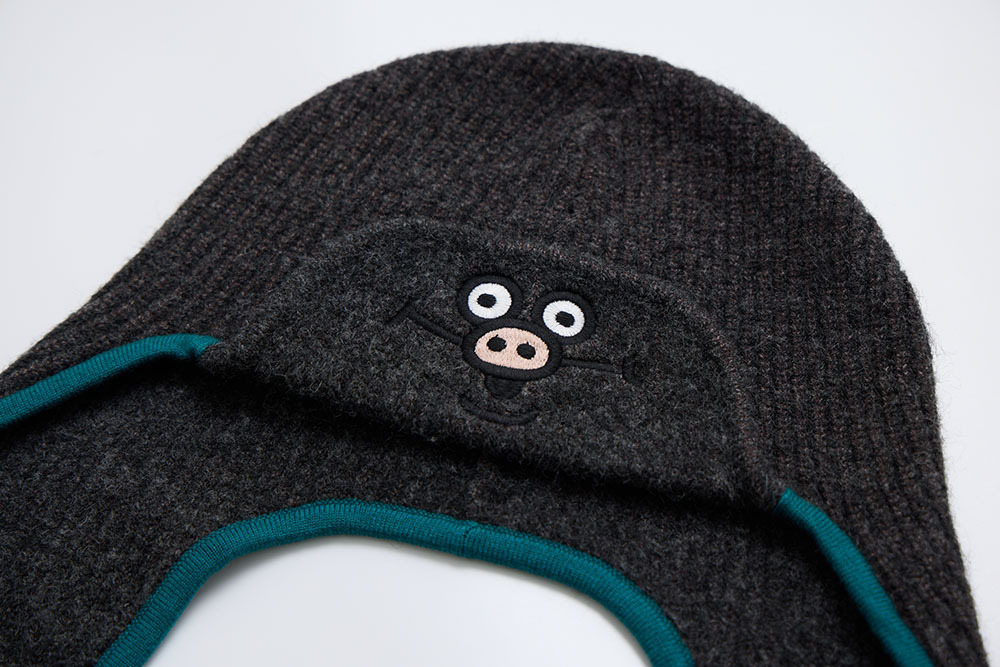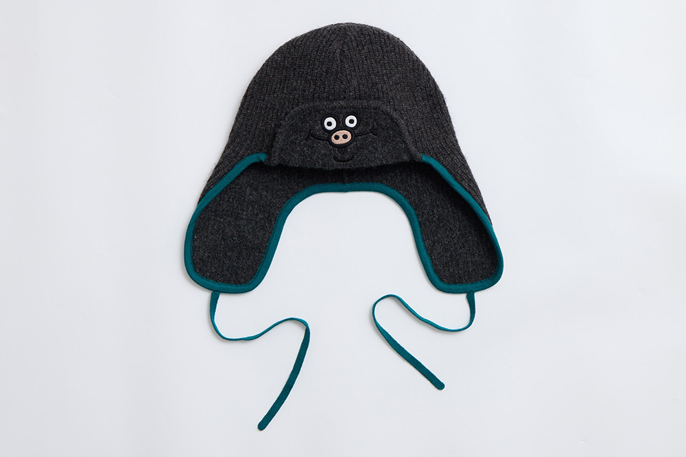 The beanie is crafted from fluffy loop yarn, with contrasting edges and drawstrings adding a pop of color — and of course, it wouldn’t be complete without the signature embroidered dog!