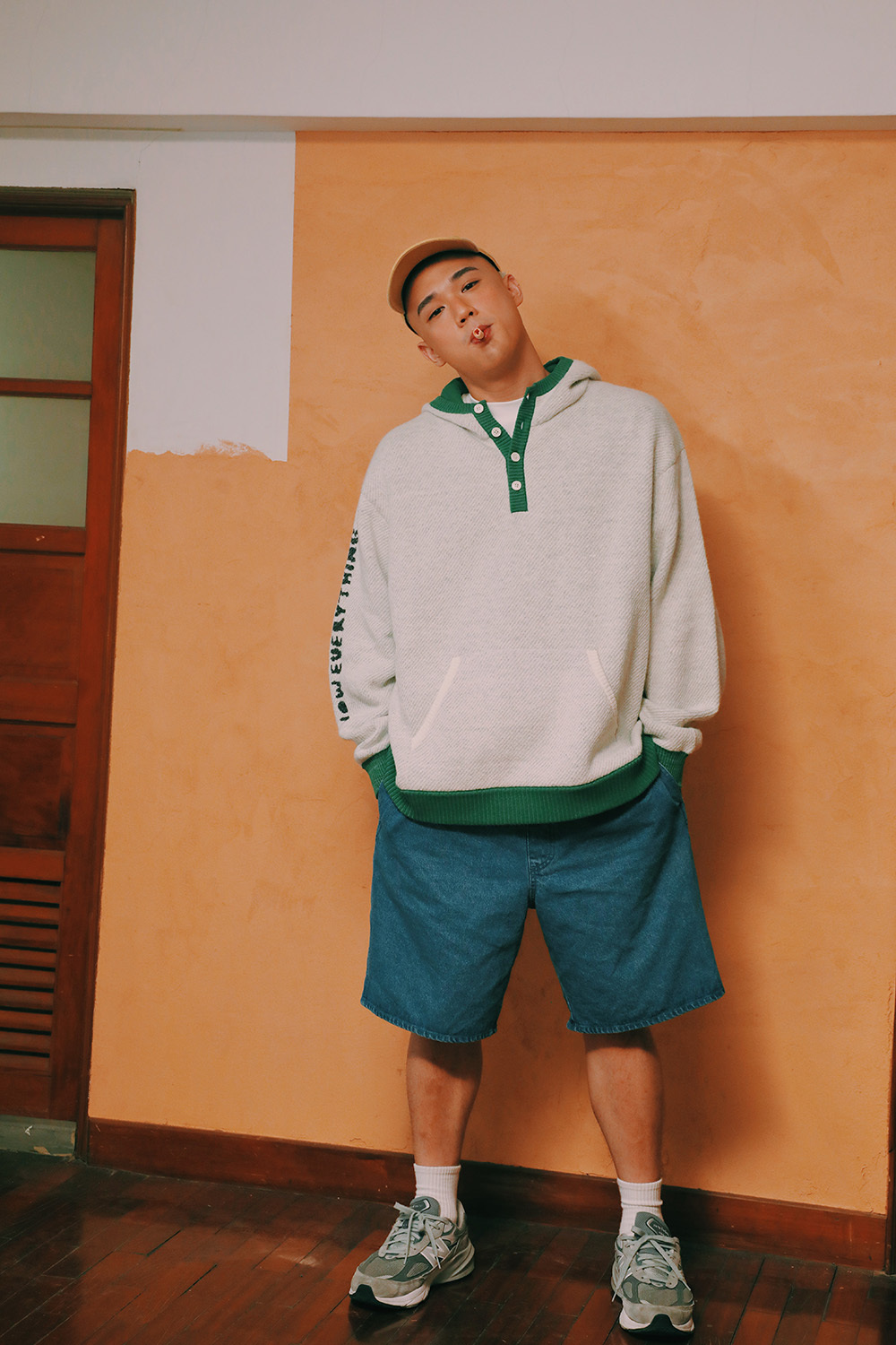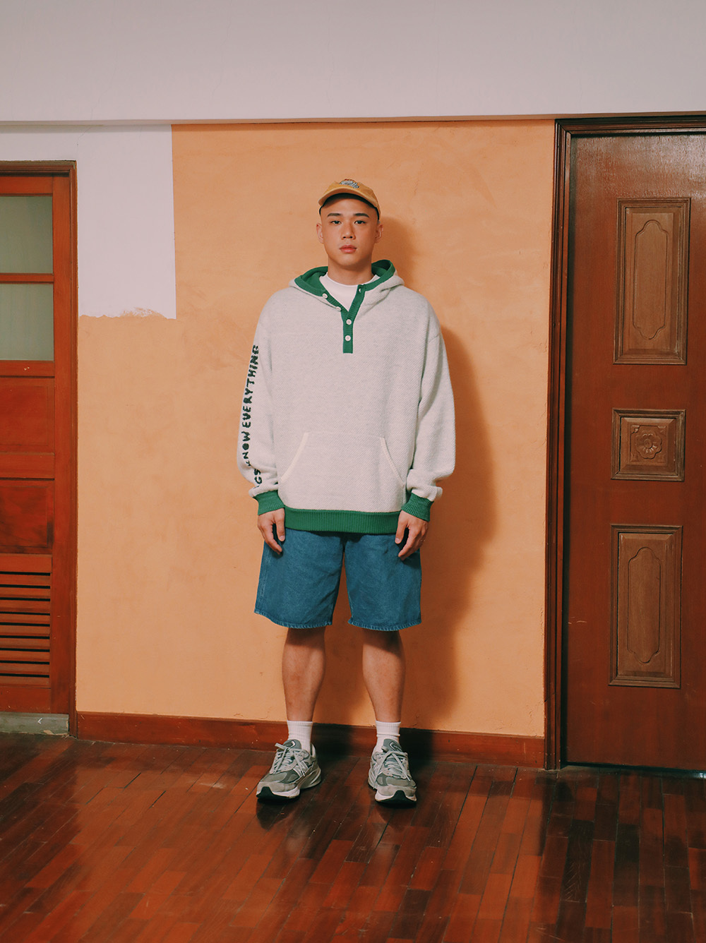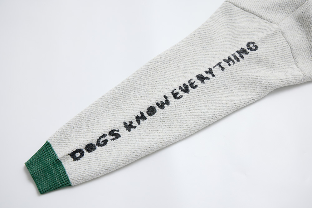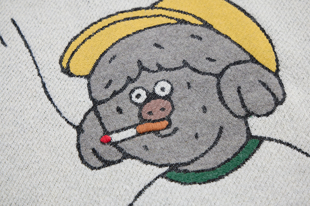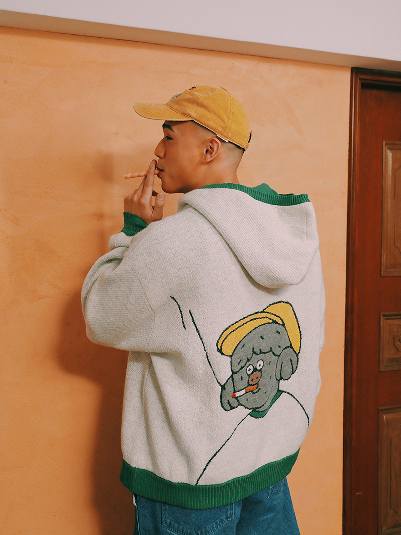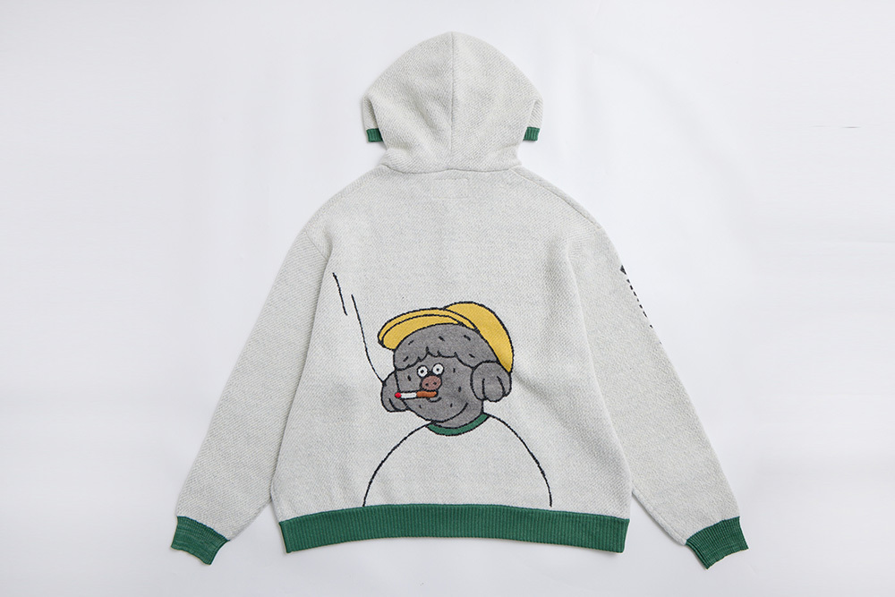 Featuring a large-hood silhouette with playful contrasting colors, this piece showcases Megumi’s iconic dog character smoking on the back. The smoke is rendered with delicate hand embroidery, making it a cute and stylish best-seller.