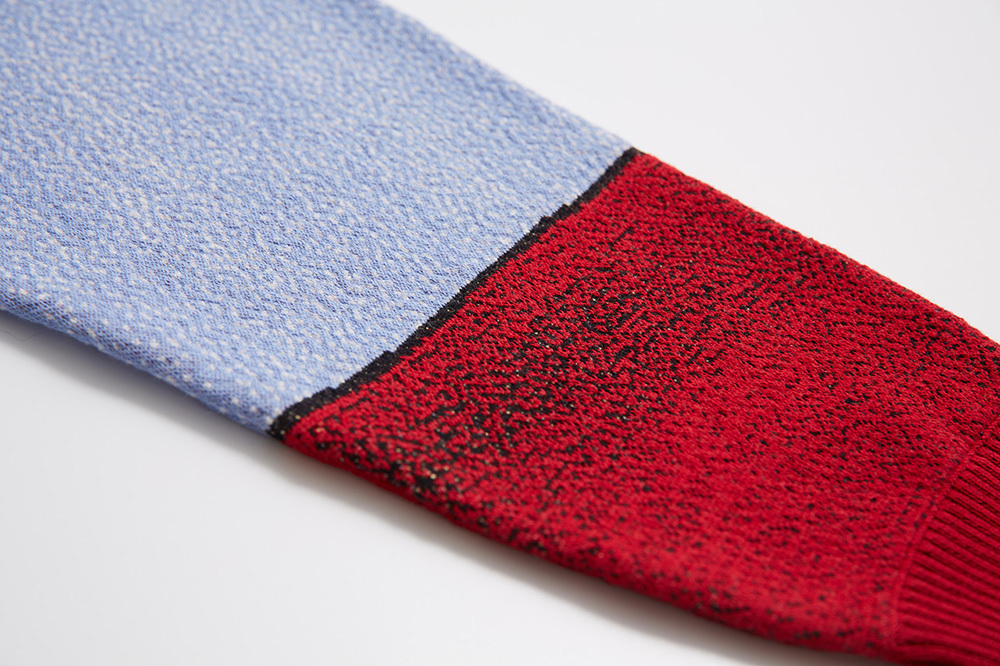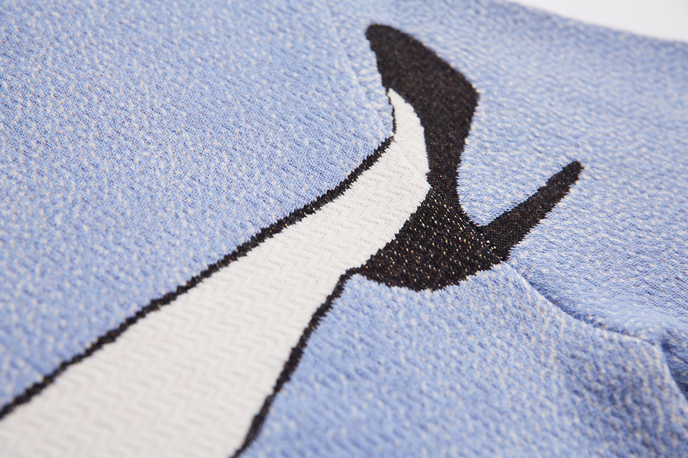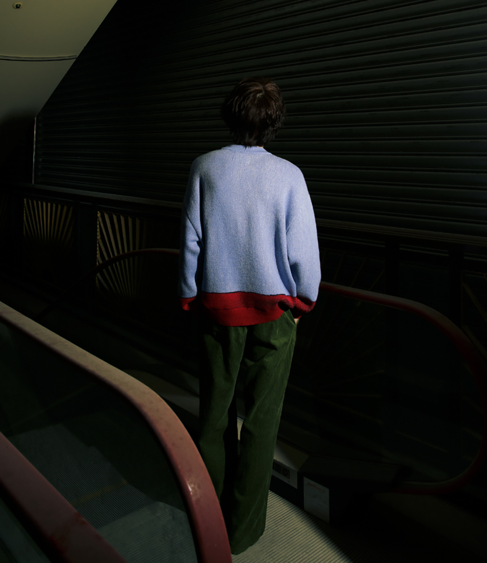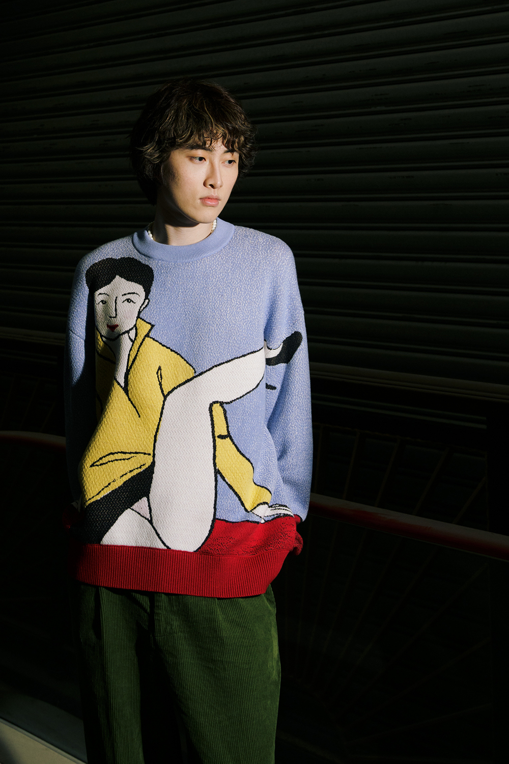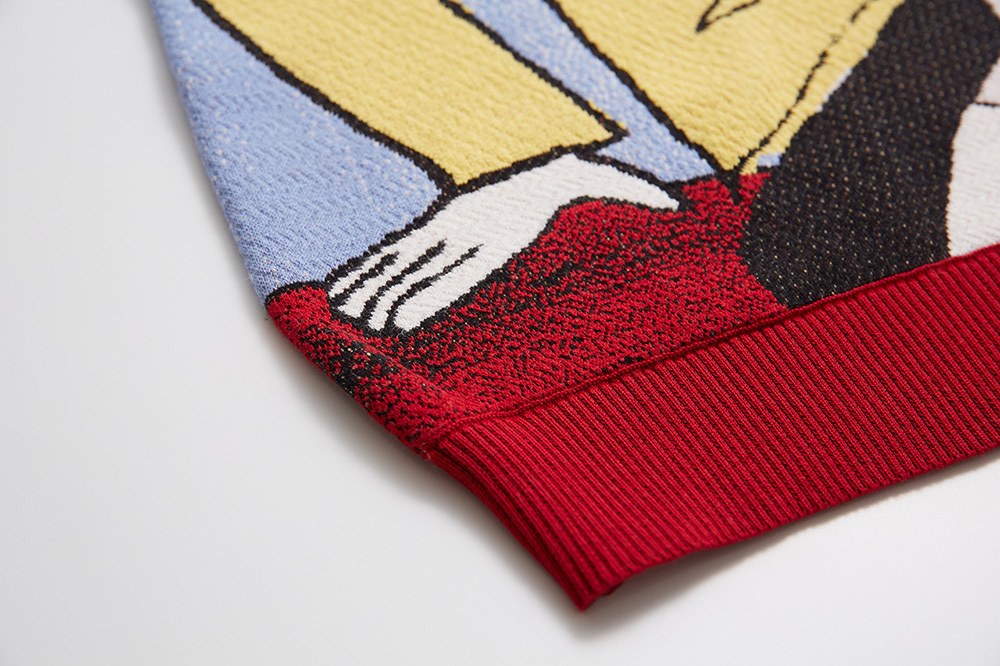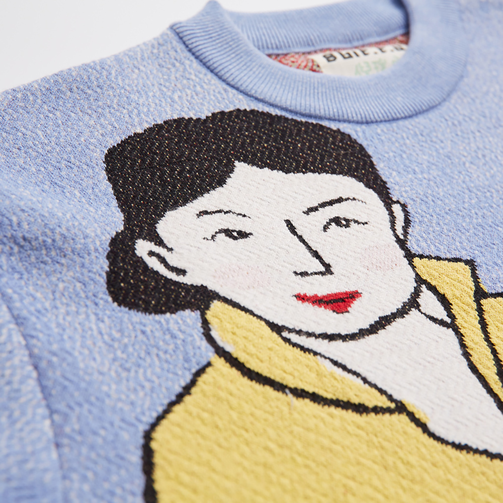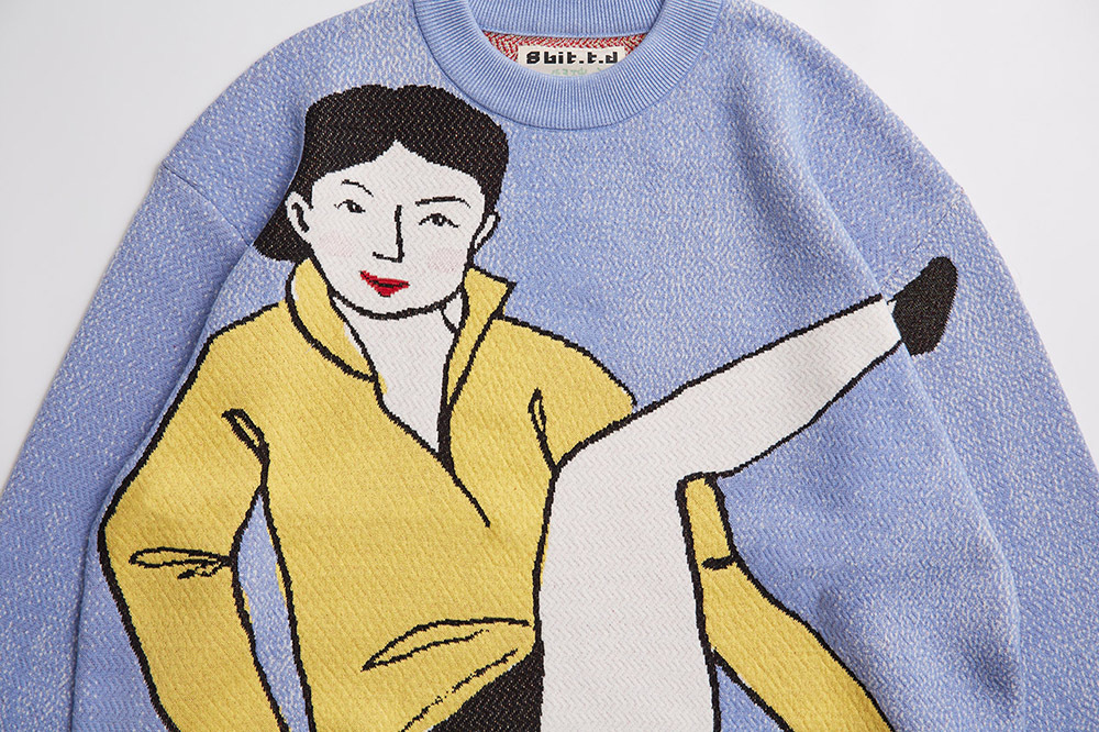 Purple pullover long-sleeves knitwear top with a girl opened her legs.