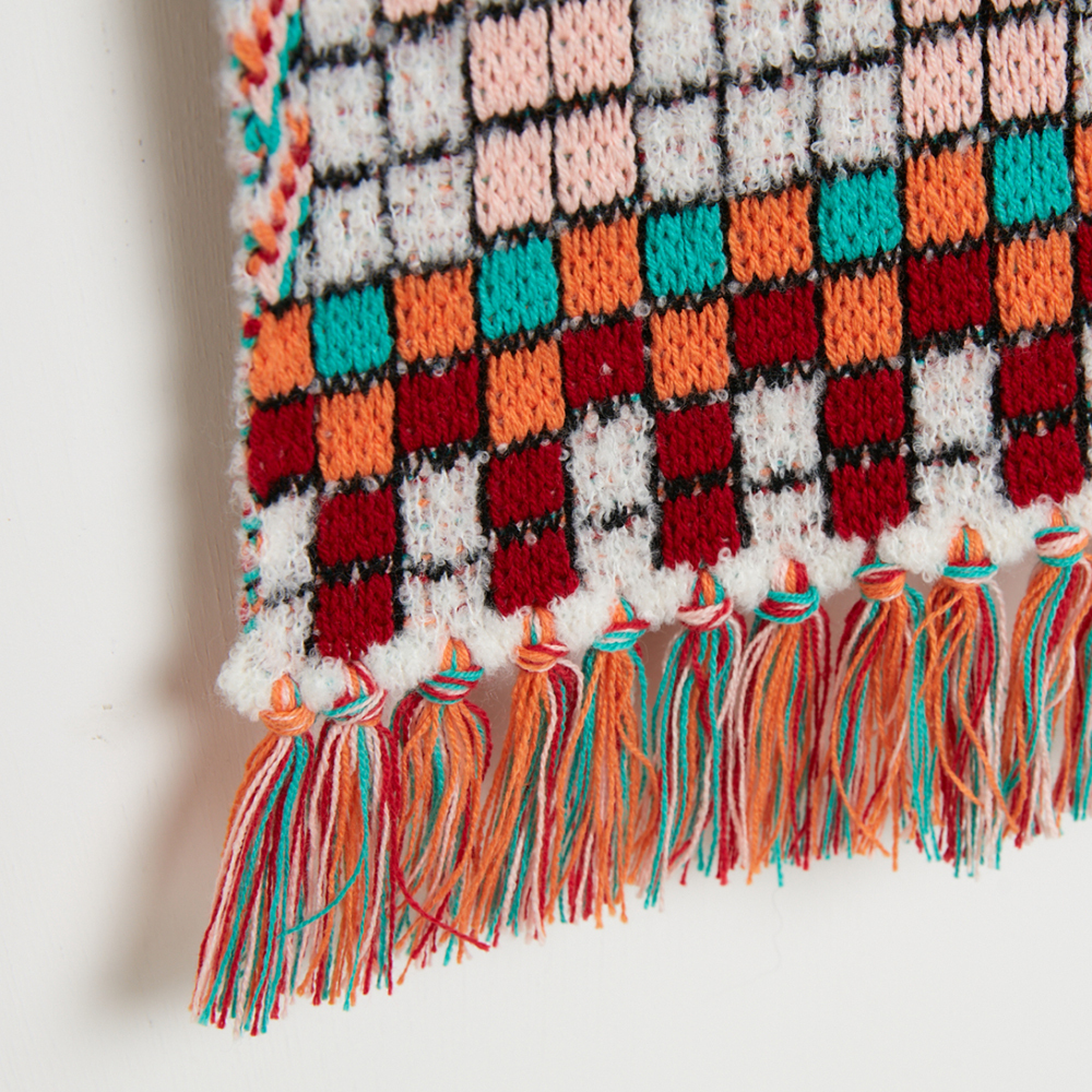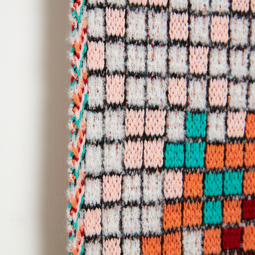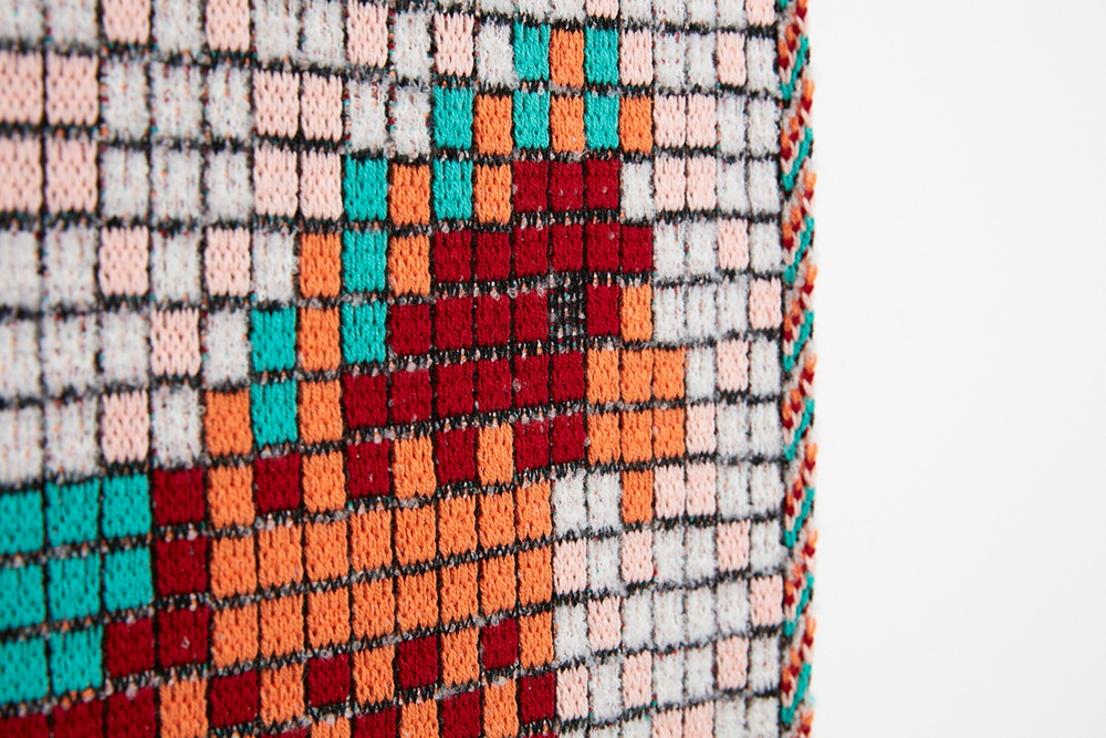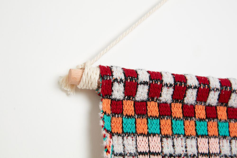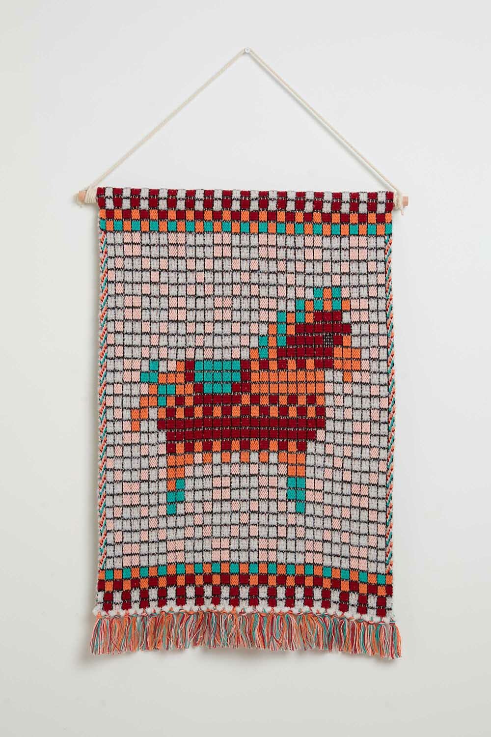 Soft tapestry with Low resolution pony pattern, a hanging stick and a string.