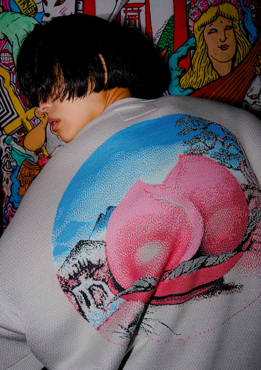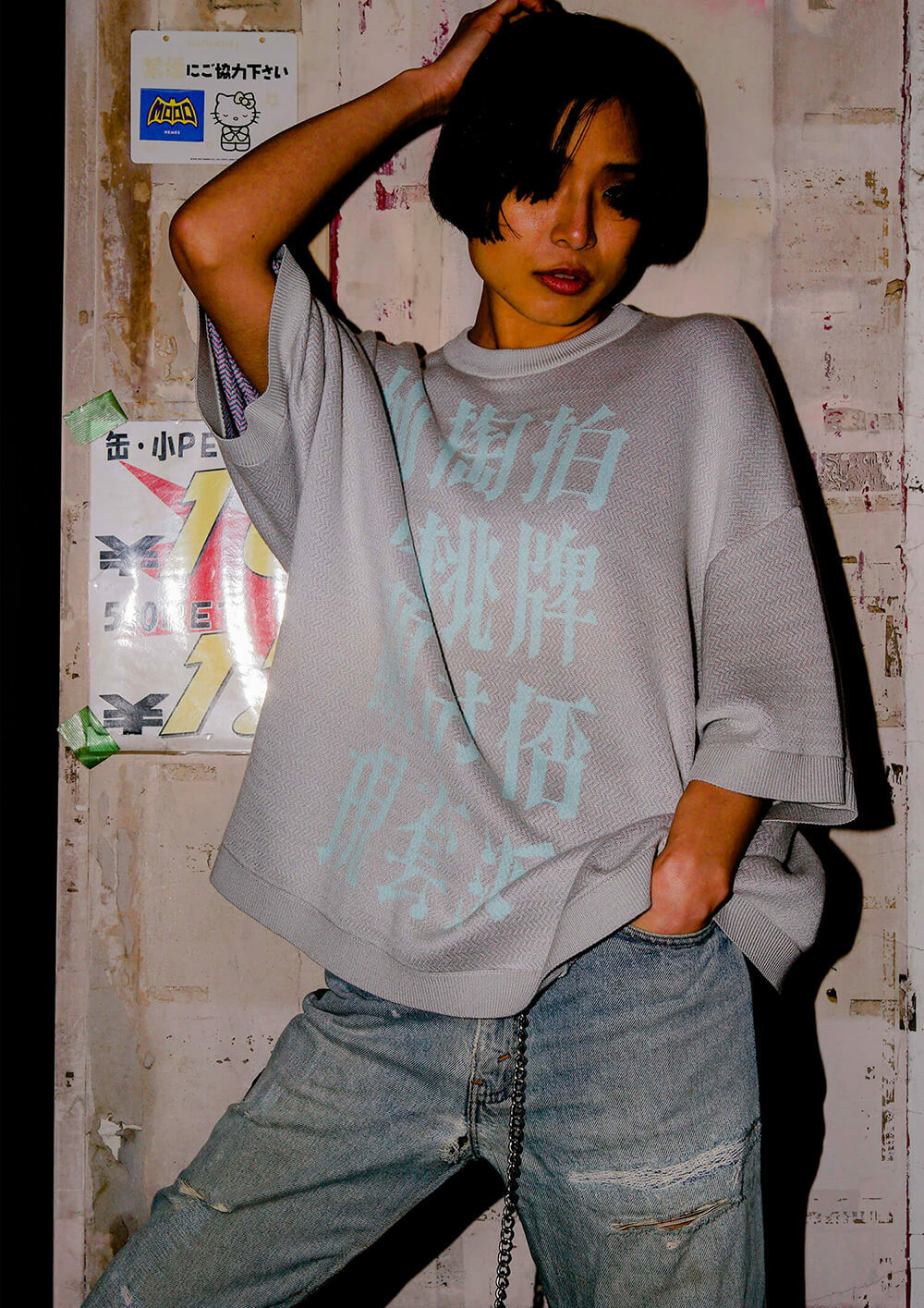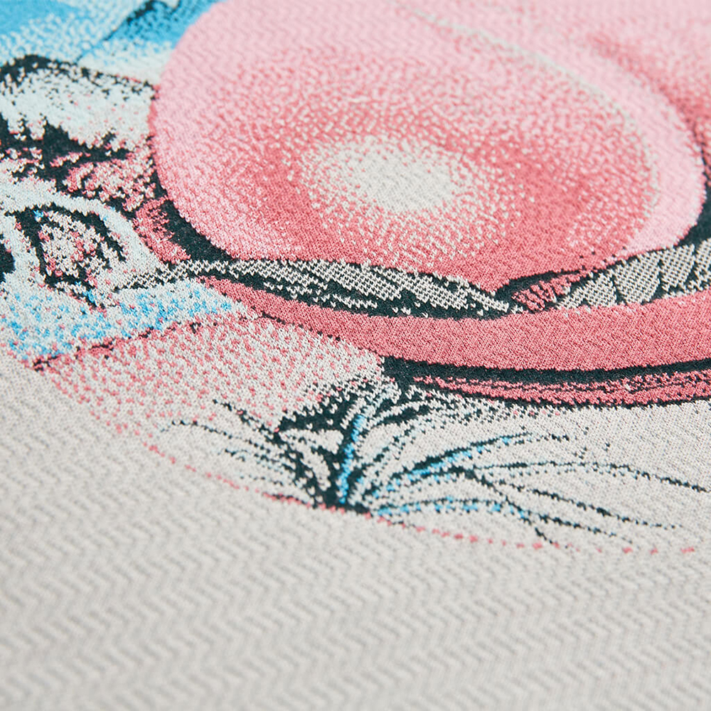 Knit T-shirt with fun calligraphy letters in the front, and a big peach in the back side.