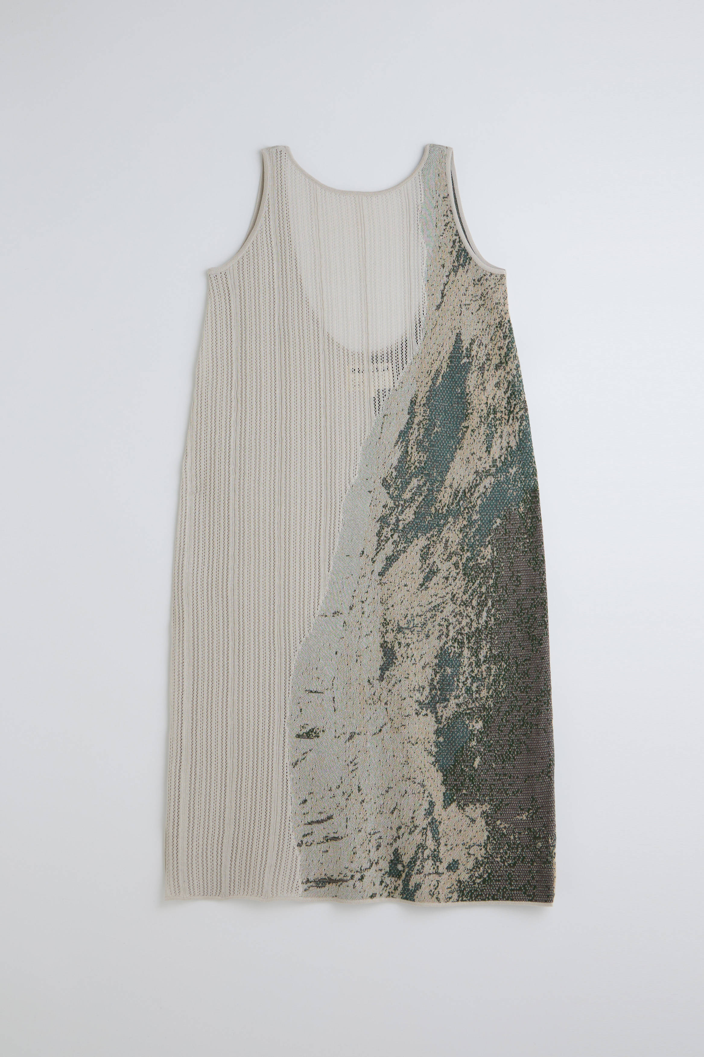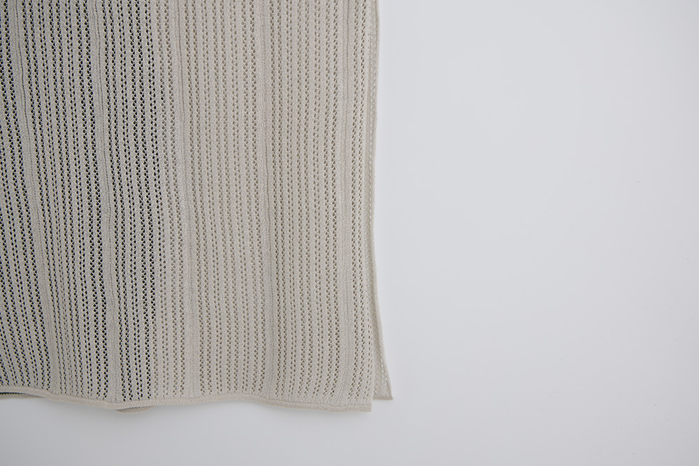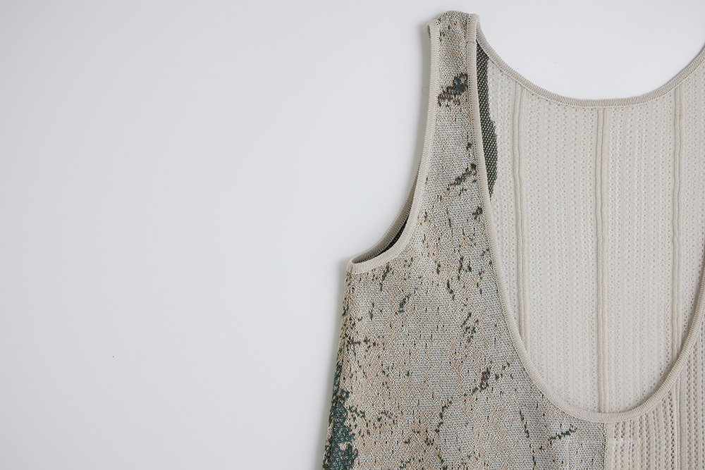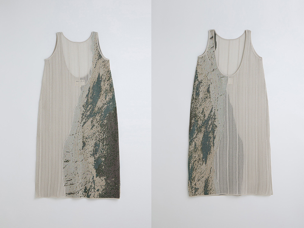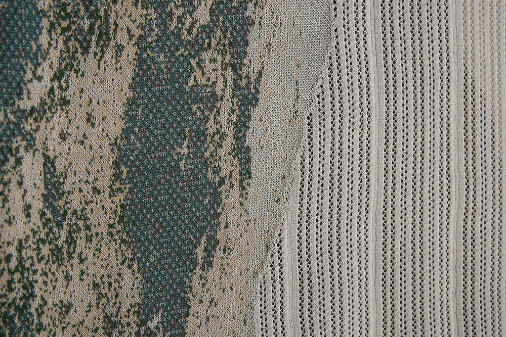 將層疊的山脈轉90度,一邊是山脈緹花,一邊是鏤空組織呈現天空。