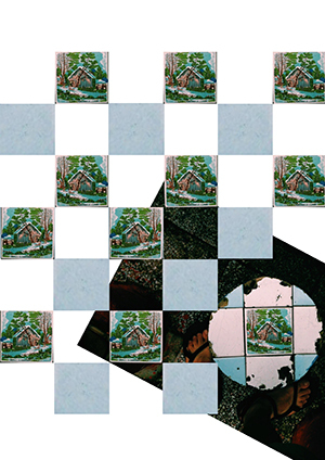 就在一座水泥砌成的圓凳旁,我發現了一片罕見的磁磚——描繪著山中靜謐風景與小屋的圖案,