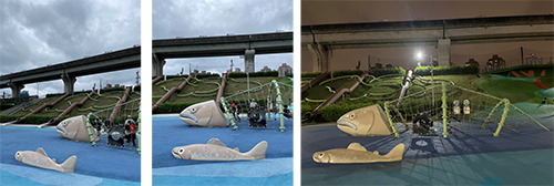 以夜晚的遊樂場剪影為背景,白色小魚排列成網子的形狀游在背景上。