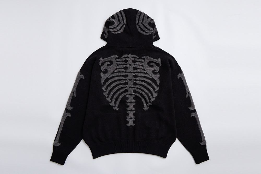 與藝術家D.3.C合作,製作出以骨骼為主角,用毛圈組織展現強調出織物立體感。