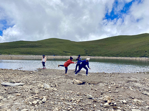 我們在湖畔開起午餐派對,在熱辣的陽光下、三千公尺的山上,