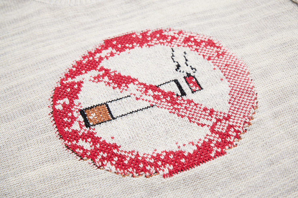 以那個畫面為靈感,選擇用像素感的針法重構這個帶有錯置感的「禁菸符號」,
