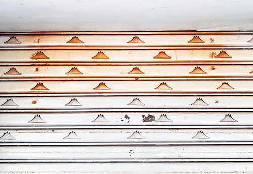 藍色是新上油漆的鐵捲門,橘色則是上面有繡斑的鐵捲門。
