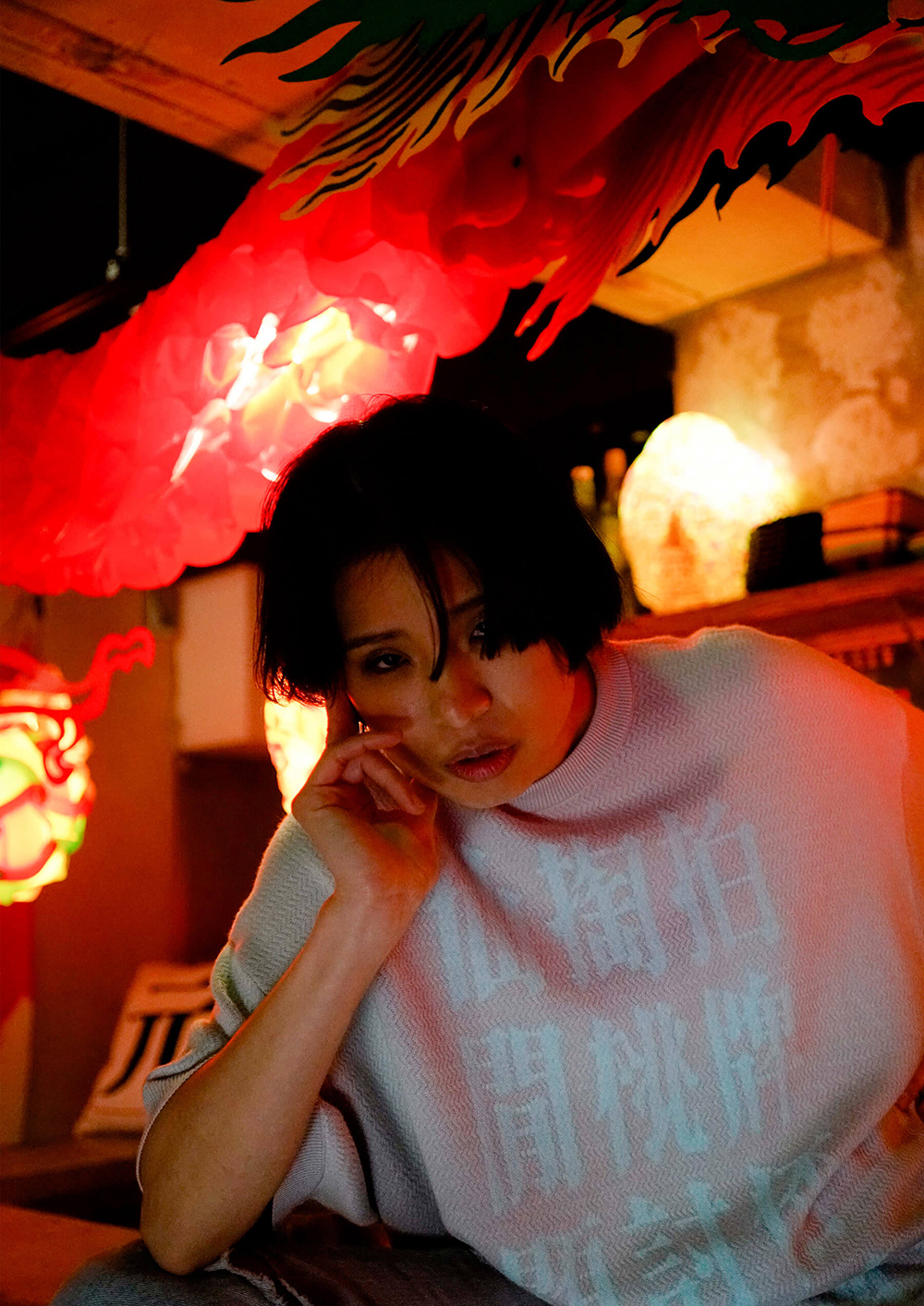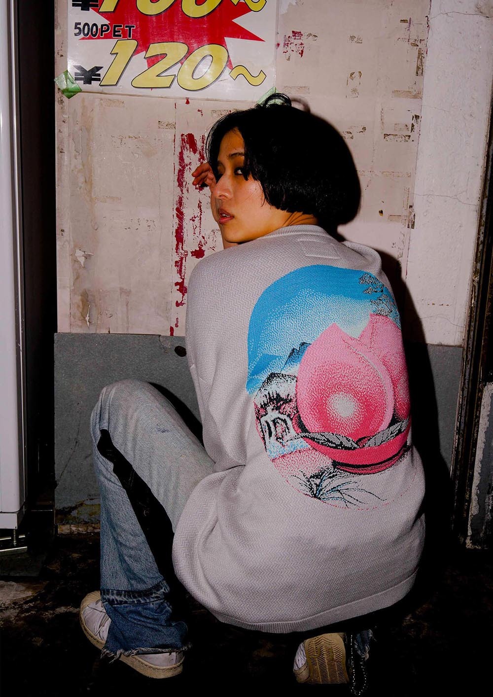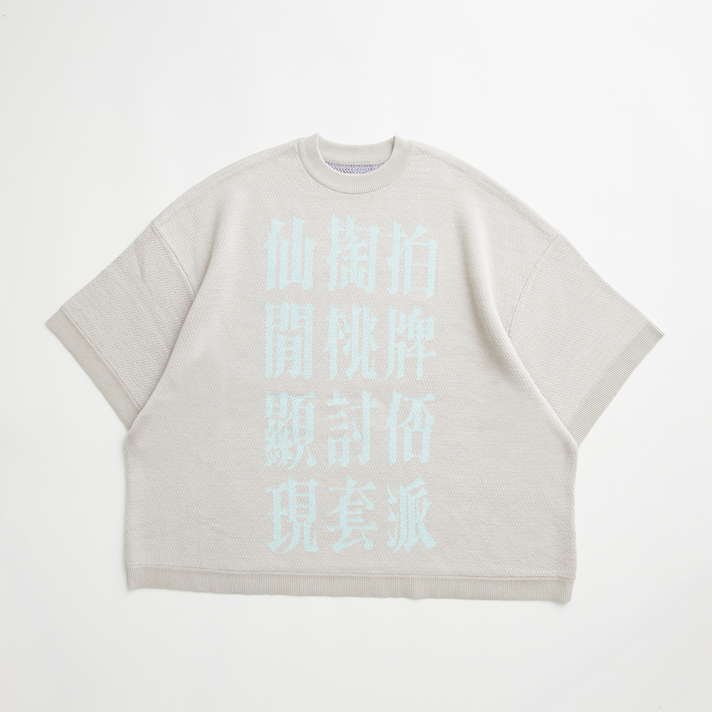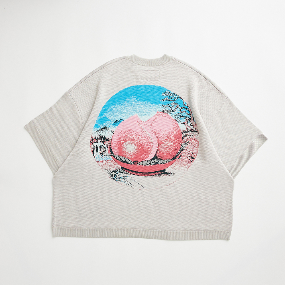 正面有書法圖案,背面有一顆大壽桃的短袖針織T-shirt