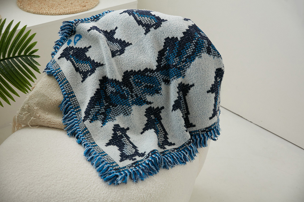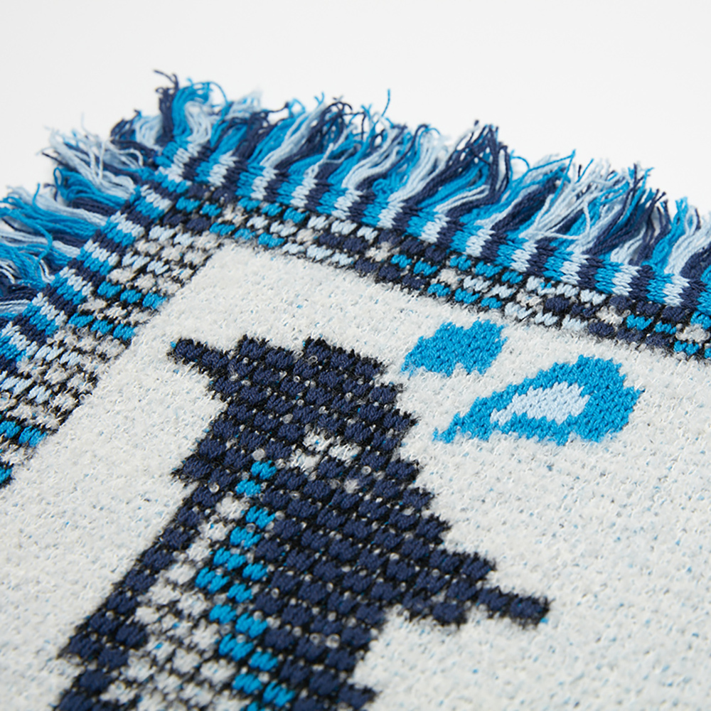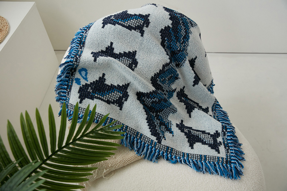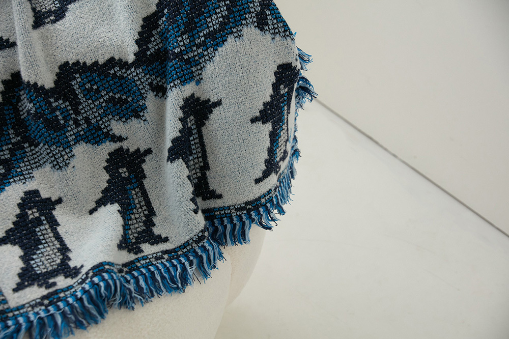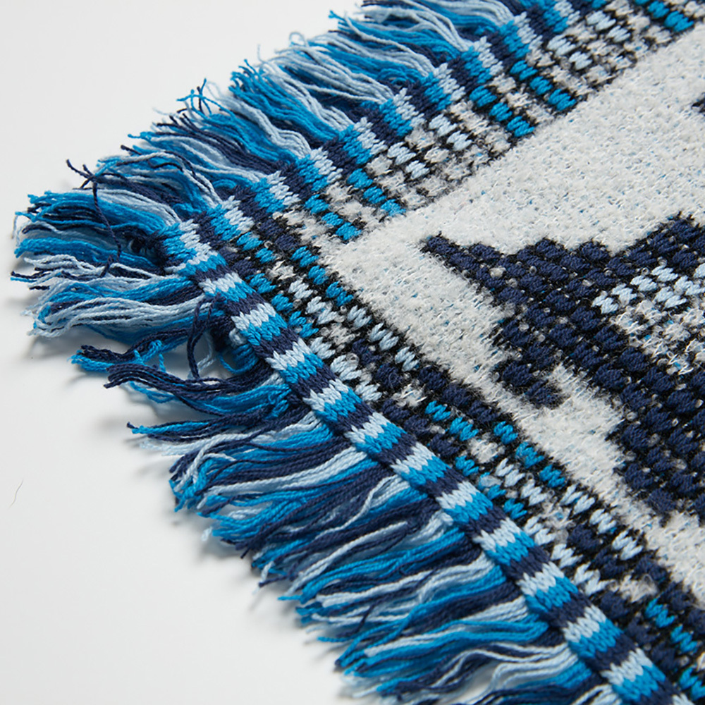 羊毛混紡的的織毯手感綿綿暖暖的,四周有藍色流蘇